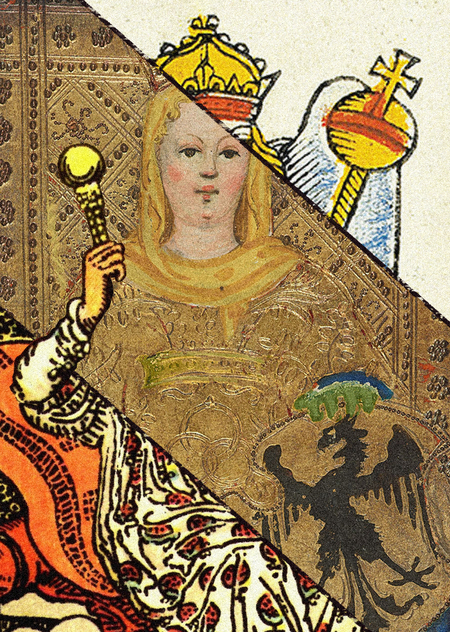 III. Императрица. Образ правительницы средневековых карт остался прежним. Изображение государыни, символизирующее статус жены и матери, щедрость и плодородие, повторяется и в «Таро Висконти-Сфорца», и в «Марсельском таро»: величественная императрица на троне, на голове которой расположена корона, а в руках — щит с гербом Священной Римской империи и скипетр, древнейший символ власти. Единственным нововведением «Марсельского таро» стало внедрение в общую композицию карты «нечто похожего на ангельские крылья» за спиной героини, которое некоторые исследователи связывают с «божественной природой <…> образа» королевы.