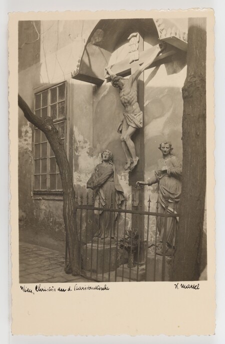 Jodok-Fink-Platz — Piaristenkirche «Maria Treu» — «Christus an d. Piaristenkirche», Ansichtskarte, 1930 / Johann (auch Hans) Markl (1896—1953), Fotograf