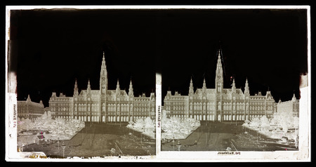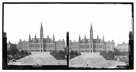 Rathausplatz 1 — Rathaus — Hauptfassade — erhöhter Blick über Rathauspark vom Universitätsring, 1883 / Michael Frankenstein & Comp. (1843—1918), Fotoatelier