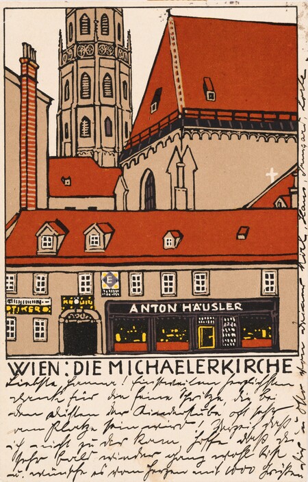 Postkarte der Wiener Werkstätte: Die Michaelerkirche, 1908 / Urban Janke (1887—1915), Künstler // Burgtor am Michaelerplatz — Ansichtskarte, 1917