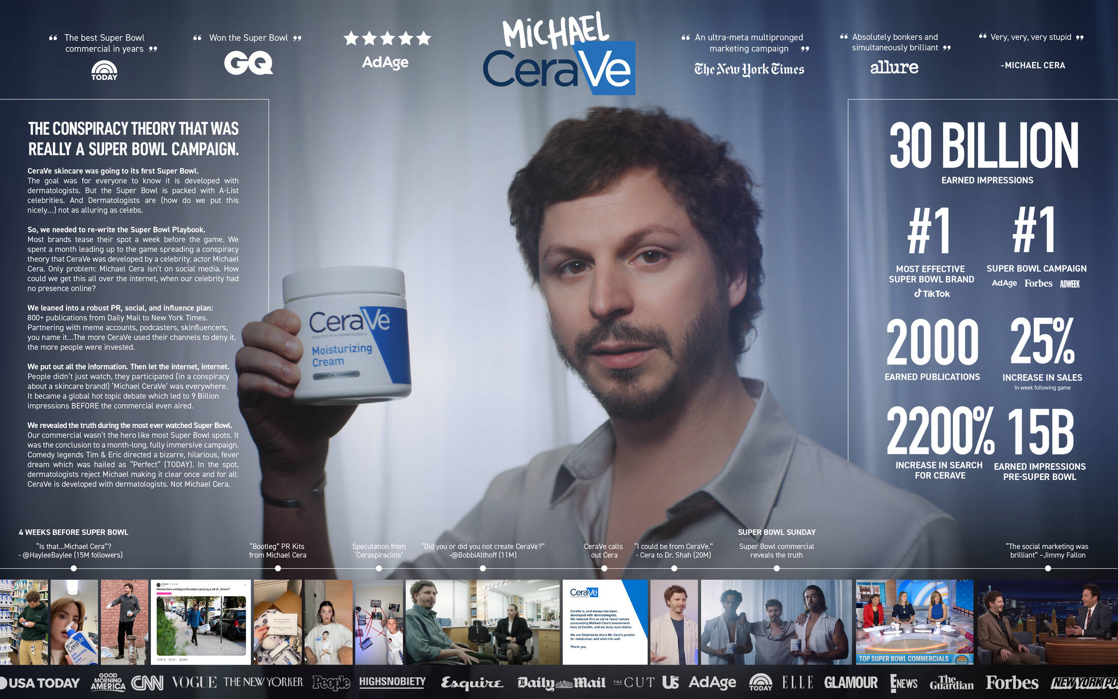 Всё началось с онлайн-открытия, когда CeraVe обратилась в рекламное агентство Ogilvy, чтобы запустить свою первую Super Bowl-кампанию, стремясь стать культурным феноменом для поколения-Z. Просматривая социальные сети в поисках идей, Ogilvy наткнулась на старые треды на Reddit, где обсуждалось совпадение имён между Michael Cera (актер) и CeraVe (бренд косметики).