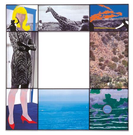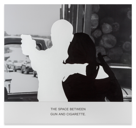 Слева — Джон Балдессари. The Space Between Gun and Cigarette, 2019; справа — Junction Series: Seascape, Landspace, Woman, and Giraffe (Captured), 2002