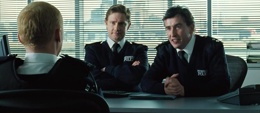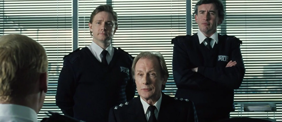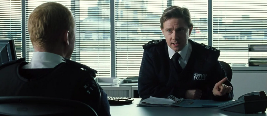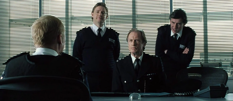 Также на протяжении спора визуально подчеркивается отношение между офицерами и их статусность. Последний кадр сильнее отличается от предыдущих, камера опустилась чуть ниже, чтобы охватить всех полицейских, так как двоим из них пришлось встать, уступив место главному инспектору. Это визуально подкрепляет звание персонажа Билла Найи, и помогает зрителю убедиться, что с главным героем общается очень серьезный и глубоко уважаемый офицер, чье слово бесприкословно.
