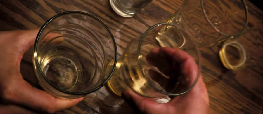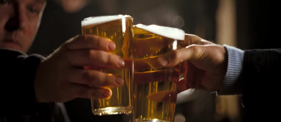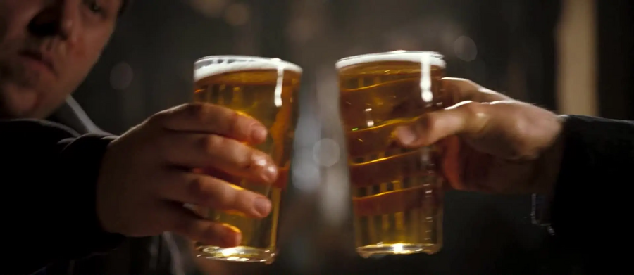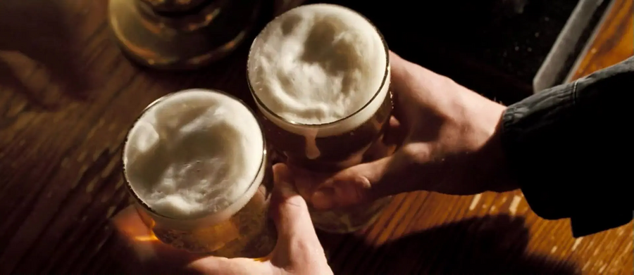 Далее идет нарезка: офицеры покупают пиво, чокаются, выпивают и ставят опусташенные стаканы на стол. Кадры повторяются и повторяются в той же последовательности, и вот герои уже пьяны и дружны.