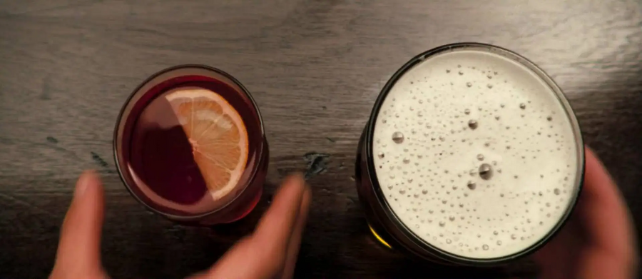 В начале Анджел не вписывается в темп жизни маленькой деревни: он излишне серьезен и строг к окружающим. Во время вынужденного похода в местный театр он все еще сдержан. Даже под самый вечер, когда напарник предлагает ему расслабиться и выпить, вместо алкогольного напитка он заказывает себе клюквенный сок. С течением времени сержант начинает сближаться с констеблем, они проводят время в пабе где открываются друг другу, и мы можем заметих похожий кадр с напитками, только теперь они оба берут себе по пиву.