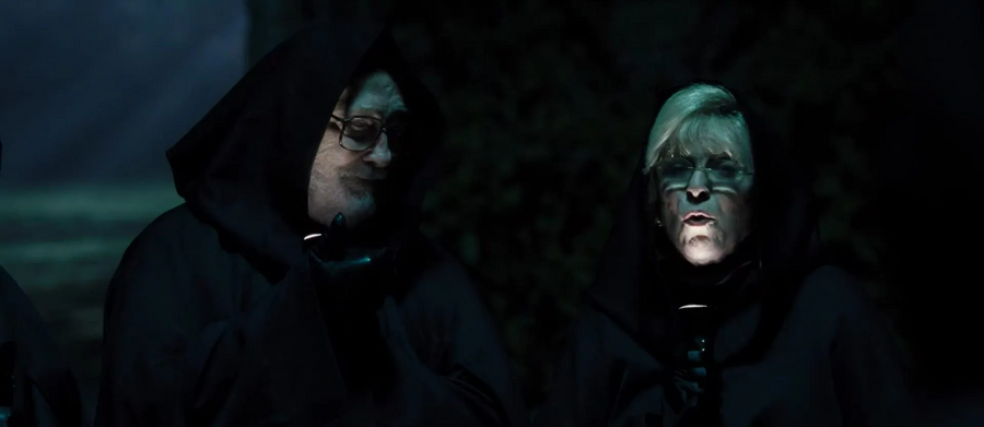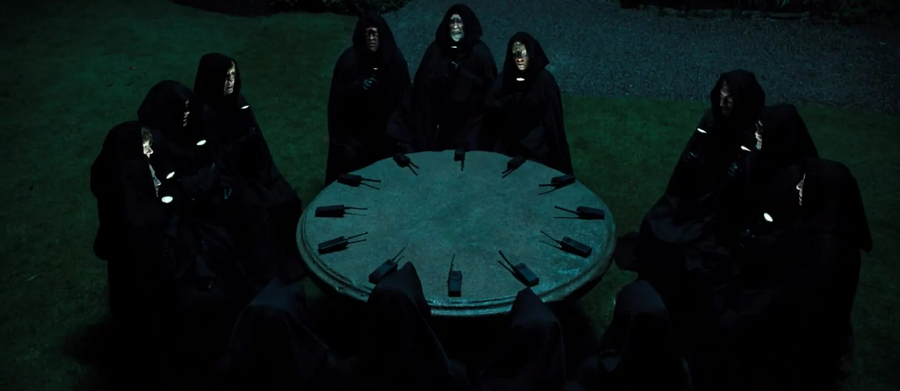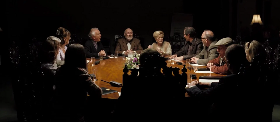 Рассмотрим эпизод, в котором расскрываются антогонисты истории и поговорим о том, как освещение дает нам подсказки насчет сущности персонажей. Все актеры, играющие отрицательные роли, подсвечены снизу фонариками. В реальной жизни трудно представить картину, где люди освещают самих себя, а не окружение, но в игровом кино такие моменты могут допускаться для усиления зловещего эффекта.