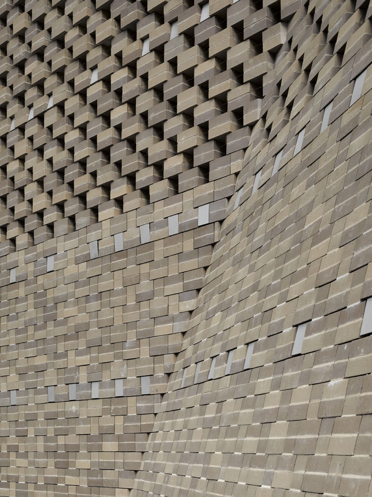 Стальной каркас с клинкерной кирпичной облицовкой демонстрирует конструкцию и поток нагрузки прямо на фасаде.
