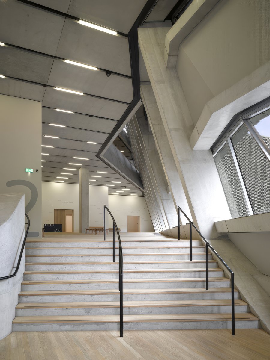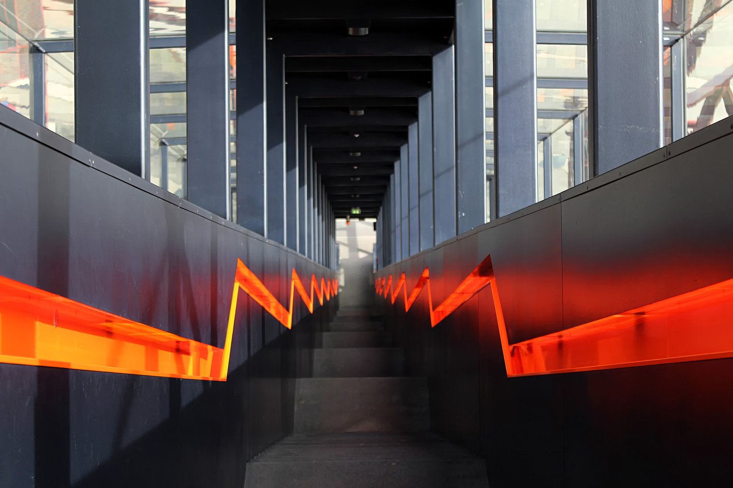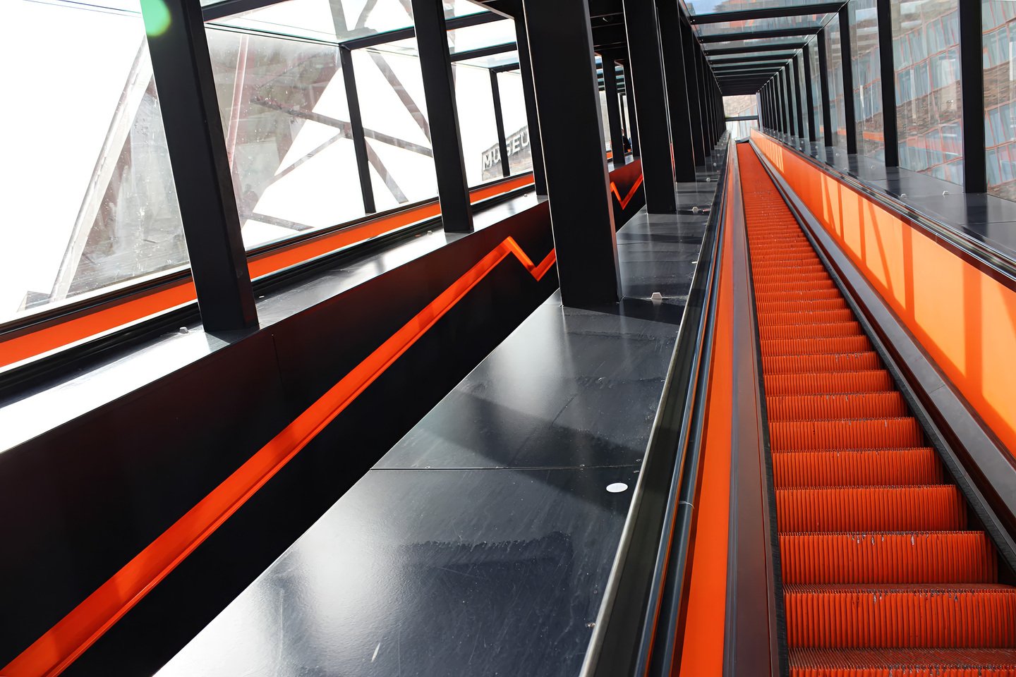 Оранжевый эскалатор, новые мосты, выставочные галереи не маскируют, а подчёркивают разницу нового и старого. Бывшие производственные и транспортные артерии превращены в маршруты для пешеходов, событий и выставок, сохраняя индустриальные материалы и формируя новую экологию вокруг комплекса.