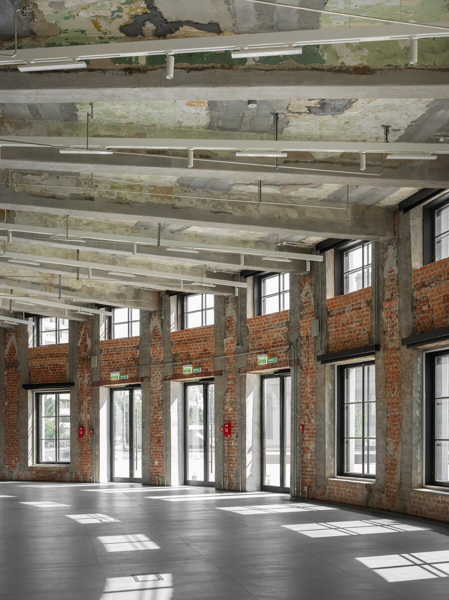 Существующий кирпич и стальные конструкции исторической электростанции: их максимально очистили, усилили и оставили в работе как несущие и визуально читаемые элементы.