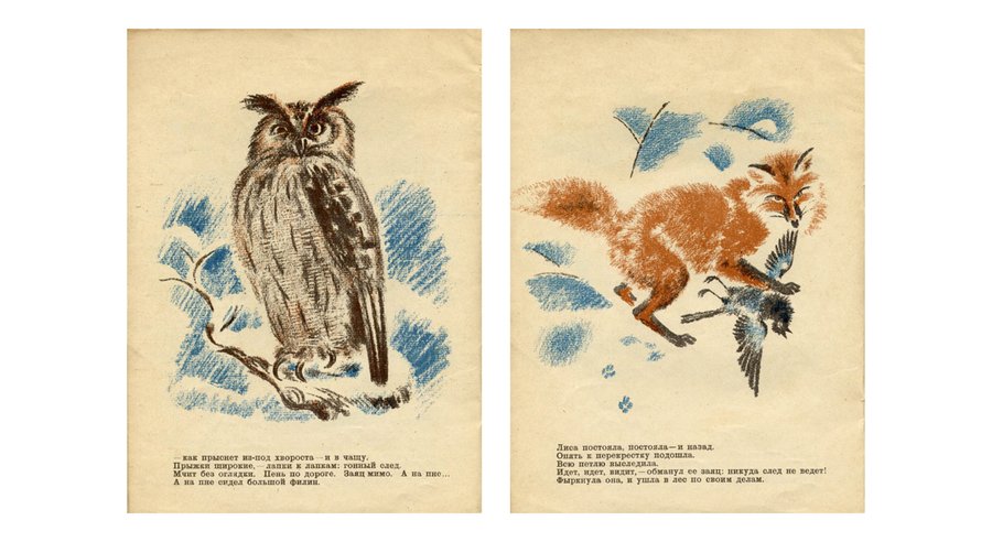 Видно, что иллюстрации к произведениям Бианки очень вариативны — от мягкой фактурной литографии Чарушина до чёткой линейной графики Конашевича, мягких мазков сангиной Тырсы и т. д.