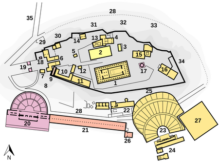 Рим. План Римского форума в императорский период: 1. базилика Эмилия 2.курия 3. храм Конкордии 4. храм Веспасиана 5. портик 6. храм Сатурна (хранилище государственной казны) 7. арка Септимия Севера 8. арка Тиберия 9. ростры 10. мемориальные колонны 11. базилика Юлия 12. вестибюль императорских дворцов 13. храм Диоскуров 14. арка Августа 15. храм Юлия 16. храм Весты 17. атрий весталок 18. Регия 19. храм Антонина и Фаустины 20. героон Ромула 21. базилика Максенция 22. вестибюль Золотого дома 23. арка Тита 24. храм Венеры и Ромы