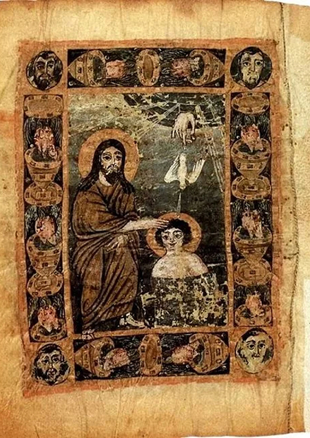 Одна из четырех «финальных» миниатюр, приплетенных к рукописи 989 года. Демонстрирует раннехристианский стиль: плоскостность, локальные цвета и символизм. Река Иордан здесь может быть изображена аллегорически, что отсылает к псалмам.