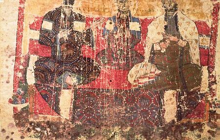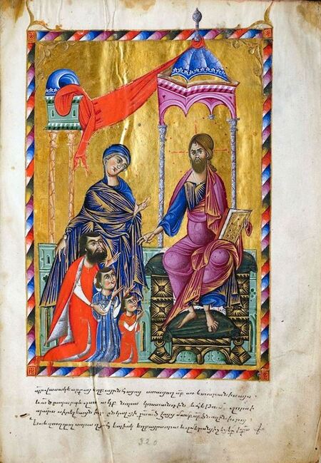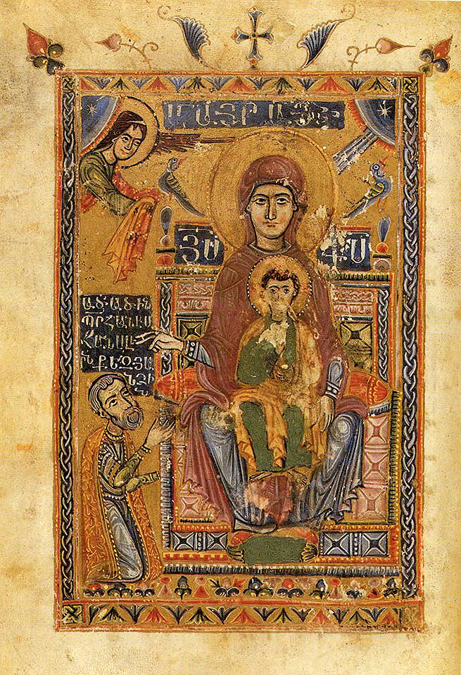 Знаменитый ктиторский портрет из Евангелия царицы Керан. Образец синтеза культур: одежды по западной моде, но иконография армянская. Символ политической и культурной адаптации армянской элиты.