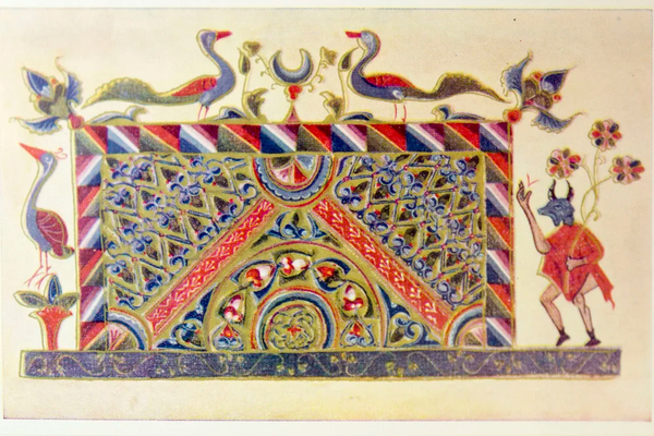 Вероятно, из Евангелия Васака. Пример виртуозного владения орнаментом и цветом. Киликийская школа здесь демонстрирует идеальный баланс между изображением и декором. Деталь той же рукописи (Скевра или Ромкла). Богатые заставки (хораны) с птицами и фантастическими существами. Символика райского сада.