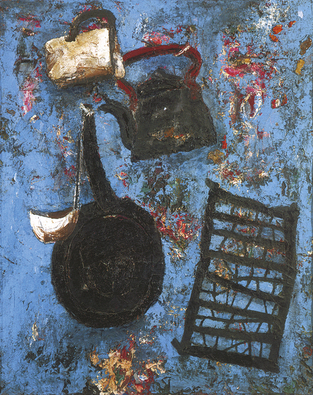 Сл.: Кухонные предметы на фоне голубой стены. Антонио Берди. 2003 Спрв.: работа из серии «Эпос о Гильгамеше». Ремо Бьянкеди. 2003