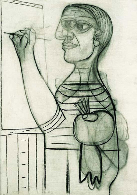 Второй автопортрет, созданный, когда Пикассо было около пятидесяти, уже полностью отражает его зрелую эстетическую систему. Выполненный углём, он показывает художника в творческой среде: с палитрой и кистью, словно подчёркивая неразрывность его личности и процесса создания искусства. Черты лица здесь значительно более стилизованы. Глаза, характерные для его узнаваемого стиля, расположены так близко, что почти перекрывают друг друга, а выражение лица передаёт внутреннюю сосредоточенность или погружённость в собственный мир.