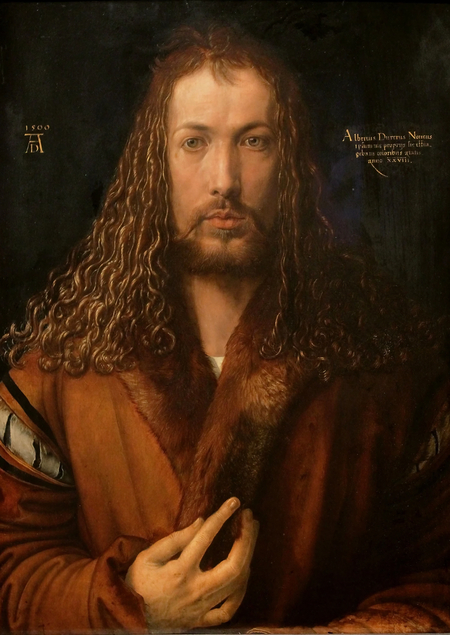 Этот автопортрет Дюрера скорее напоминает лик, ведь художник изобразил себя в анфас, что было не принято в светских портретах того времени. До сих пор художники во всех странах во все времена изображали смертного человека либо в профиль, либо в три четверти. В анфас же изображался только Бог, и это отчаянная смелость Дюрера, позволившего себе изобразить самого себя, глядящим непосредственно на зрителя.