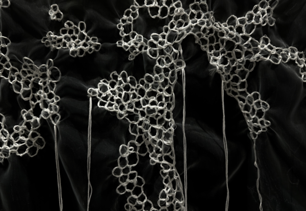 Я создам проект «Пена», чтобы представить пену как самостоятельный объект. Мне интересны ее свойства. При контакте с телом, пена оседает и покрывает его тонкой пленкой / становится его продолжением. В этих полотнах раскрывается тема призрачности и мимолетности. Нити и прозрачные ткани продолжают пустотный лейтмотив выставки.