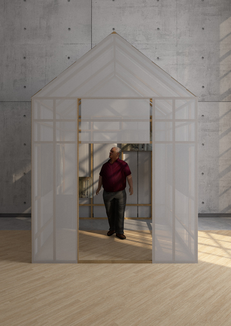 Я хотела показать, как пустота становится фоновой и собирает все материальное в одну большую игровую площадку. Этой мысли вторит тотальная инсталляция в виде каркаса дома, который оголяет внутренний «скелет» из неотесанных балок. С внешней стороны дом покрыт полупрозрачной бумагой, которая колышется от прикосновений и позволяет видеть сквозь, угадывая содержимое. Форма домика максимально простая, что отсылает нас к детскости и деталировке. Его воплощения тонкое и хрупкое, с прорехами и пустотами.