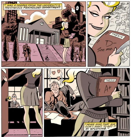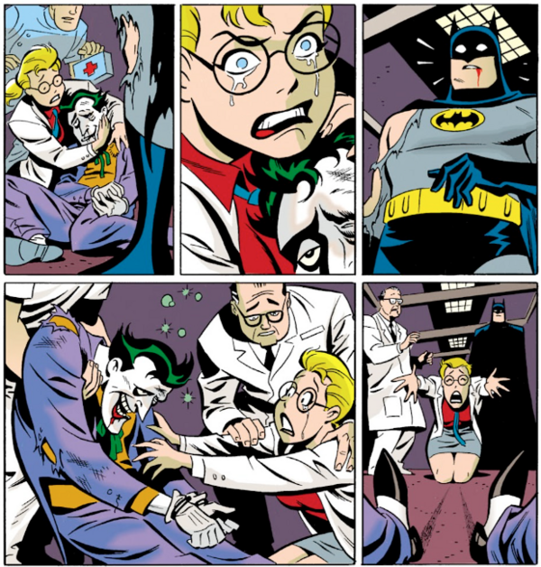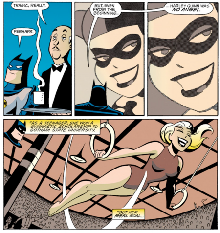 В этом комиксе авторы рассказали о предыстории Квинзель. Гимнастка, мечтавшая стать психологом. Биография девушки дает понять читателю, что она с самого начала была целеустремленным и шаловливым ребенком, студентом. В отдельности от Джокера, задолго до его появления. Она пользовалась своей сексуальностью для получения оценок, а в профессию психотерапевта пошла ради большого заработка и известности. Девушка не побоялась даже пойти работать в самую жуткую психиатрическую больницу для преступников Аркхем, что может выдержать далеко не каждый. Отсюда можно сделать вывод, что Харли склонна к поверхностности и легкомыслию, но, тем не менее, является смелой и целеустремленной девушкой [4]. То есть не Джокер стал первопричиной его лихого характера. Он, скорее, послужил катализатором и размыл для нее нормы морали.