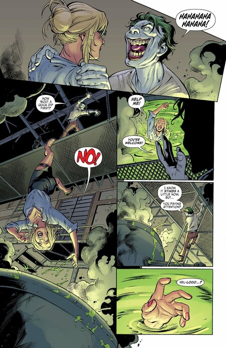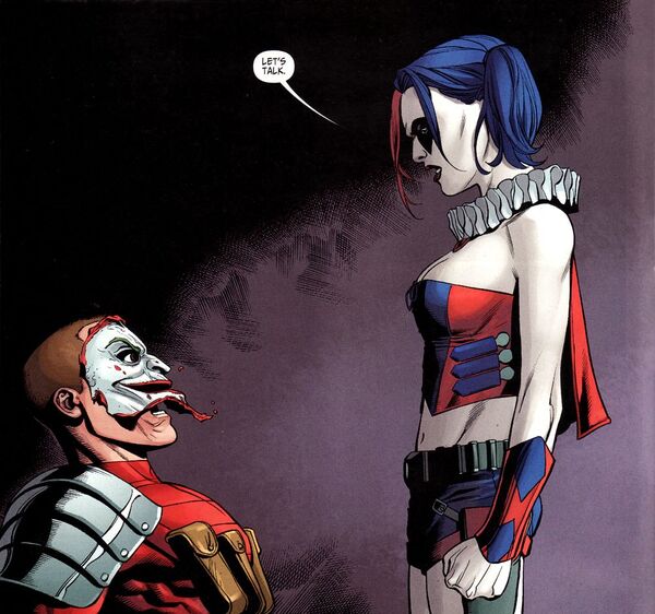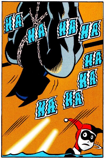 Она искренне верит, что корень всех проблем мистера Джея — Бэтмен, и, стоит ему исчезнуть, как душевные раны возлюбленного затянутся, и они смогут быть счастливы. Тогда Квинн решает поймать в ловушку Темного рыцаря. Она претворяет в жизнь страшно-улыбастую смерть из плана Джокера. Ей удается не только усовершенствовать задумку, но даже заставить Бэтмена смеяться (!), что говорит о ее находчивости и остроумности, однако Джокер не в восторге с самодеятельности подручной и приходит в ярость, вышвыривая клоунессу из окна. Девушка было осознает жестокость такого обращения к себе, попав в больницу, но, стоит ей увидеть записку от любимого, как она расплывается в улыбке и попадает в порочный круг.