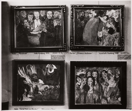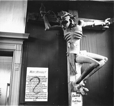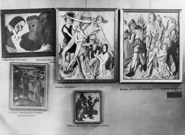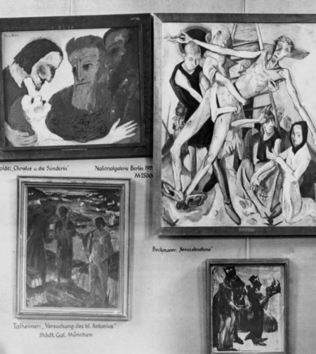 Работы Бэкманна, Нольде и других в 1 комнате выставки «Дегенеративное искусство», 1937, Мюнхен Людвиг Гис «Распятие», 1921