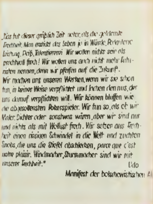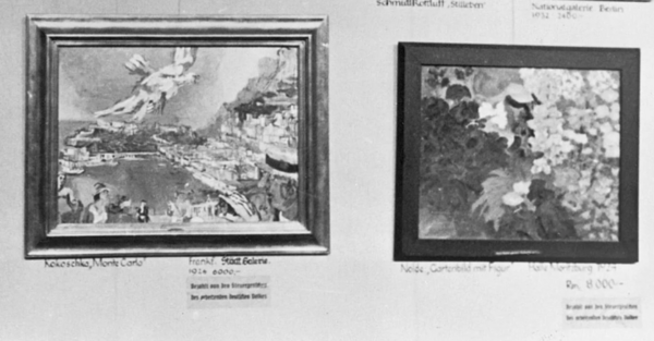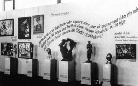 Под этими выражениями висели работы: Хофера, Кирхнера, Мюллера, Кляйншмидта и Дикса, которым организаторы зачастую придумывали новые, нарочито оскорбительные и ироничные высказывания.
