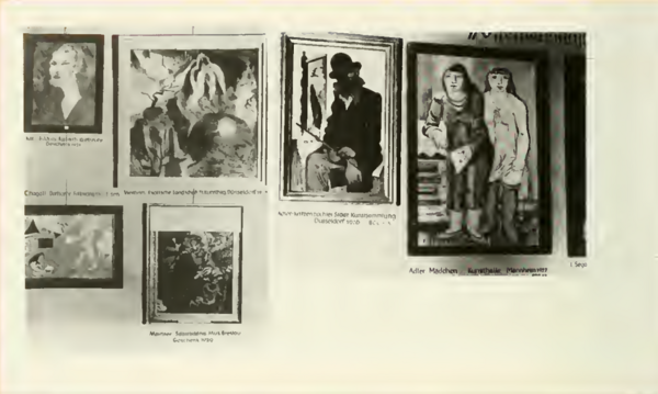 Следующий участок представлял собой череду взаимосвязанных комнат. В шестой были собраны работы наиболее известных представителей модернизма. Южная часть зала была посвящена произведениям Ловиса Коринта. Здесь же висела и знаменитая «Башня голубых лошадей» Марка. Общее экспозиционное решение сохранялось, однако многие работы оказались выставлены без названий — кураторам было проще снабдить стены надписями вроде — «сюда ушли налоги народа».