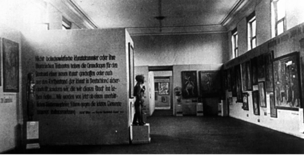 Стоит, в том числе, учесть, что важным пропагандистским контрастом являлось то, что модернистское искусство, основываясь на кураторской организации и выборе пространства, «заслуживало» ту темноту, грязь и затхлость, которые ему предлагало помещение института. В то время как «чистое» искусство презентовалось в здании «Дома немецкого искусства», оформленном в духе монументальной неоклассики. Это пространство давало масштаб и «воздух», а его просторы, объемность и помпезность подчеркивали красоту, чистоту и правильность того, что было представлено в экспозиции.