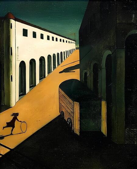 Произведение другого художника Джорджо де Кирико «Меланхолия и тайна и улицы» с изображением пустынных городских пейзажей с резкими тенями передают ощущение застывшего времени. Пустота пространства и изолированные объекты создают тревожную, почти звенящую тишину, нежели у Малевича. «Девочка с обручем бежит по пустынной улице навстречу тени, отбрасываемой скрытой за зданием фигурой.» (2) Фигура будто притаилась, но дает о себе знать.