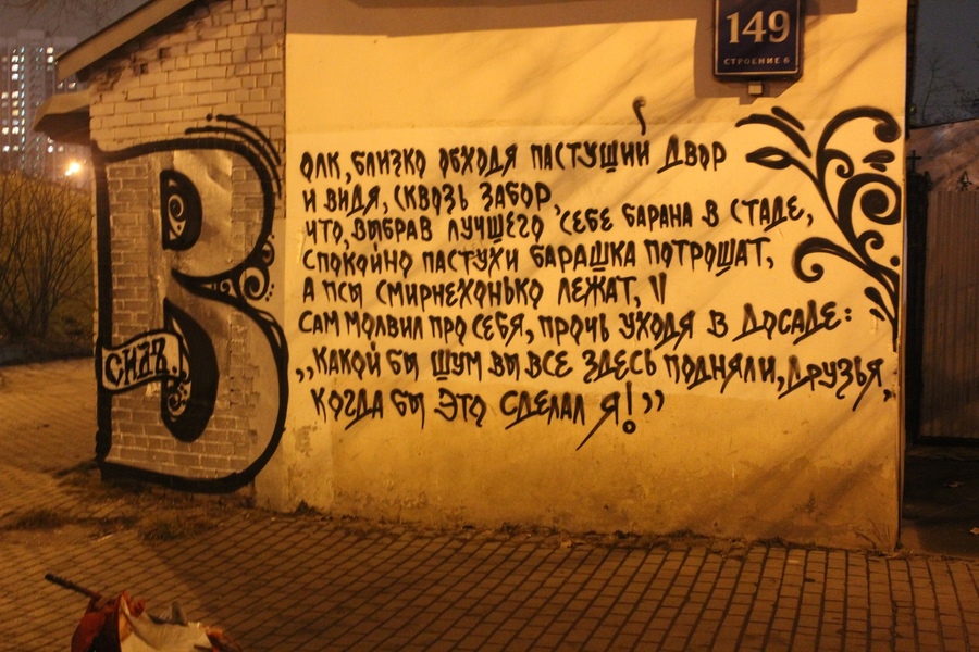 Начну говорить о уличном искусстве: все прекрасно понимают, что граффити — это то искусство, которое находится на грани вандализма. Граффити — это способ самовыражения на видном месте города. В Штатах эта история наиболее красочна во всех смыслах этого слова. У них был Taki, который положил начало уличному теггингу, а у нас был Леша из второго подъезда, который недавно расстался с Машей и решил написать маркером у ее двери, кто она на самом деле. У Великобритании был Бэнкси, который вложил всего себя в культуру стрит-арта, а у нас были художники, которые шли домой после занятий в художественной школе. Конечно, со временем у нас появилось множество великолепных граффити-райтеров и стрит-арт-художников, которые вложили огромную часть себя в развитие хип-хопа, как целостной субкультуре в России, но это стало позднее. Изначально у граффити-райтеров не было баллонов, кэпов и сквизеров, что помогло бы им влиться в субкультуру, как в США, но эта проблема не могла существовать вечно. В конце концов, до сих пор многие уличные художники используют валики и банки с эмалью для ночного бомбинга.