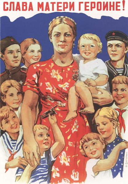 Женщина-мать-героиня выступала как воплощение высших ценностей социалистического общества: заботы о будущем поколении и героической защиты Родины. Такой стала новая Советская женщина. Теперь, она не то, что равна мужчинам, она обязана трудится в два, а то и в три раза сильнее. Ведь на ее плечах работа, дети, будущее СССР. За все это теперь несет ответственность женщина.