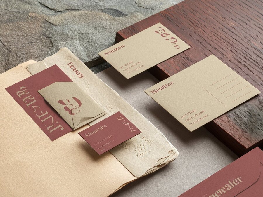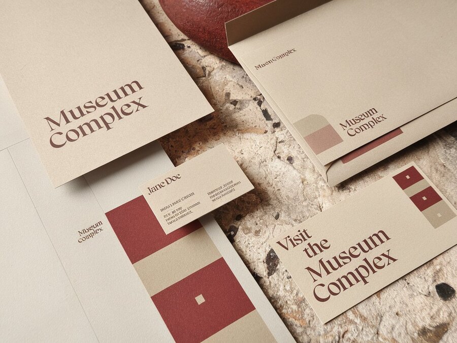 Первый промпт: Generate a minimalistic mockup of printed materials: paper, envelope, business cards, postcard for the museum complex, using reddish and earthy colors and stone texture in background.
