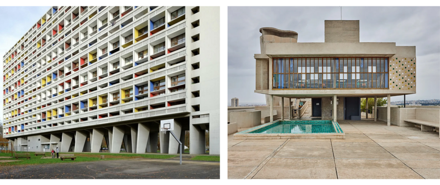 (1)Джерри Ван Эйк, Тюфелева роща, Москва, 2018 (2)Ле Корбюзье, Марсельская жилая единица, Марсель, 1945-1952