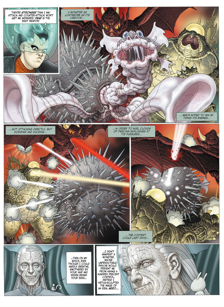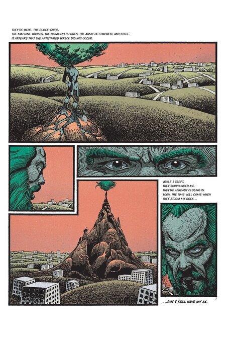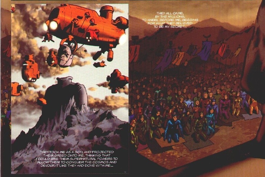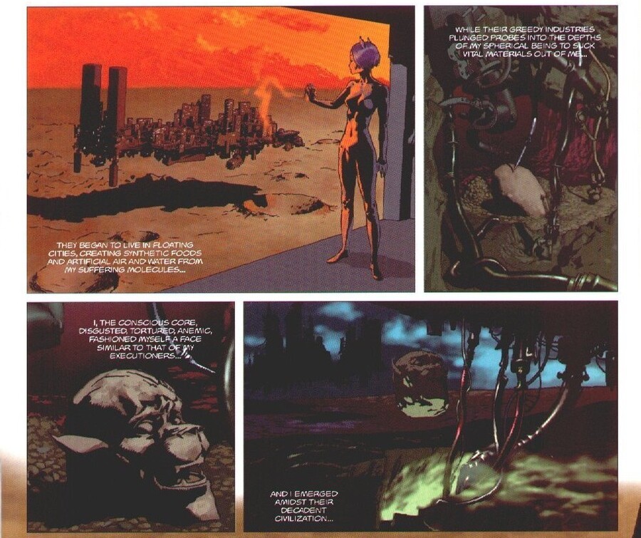 В «The last world» летающие корабли также имеют плавную форму, но отличаются друг от друга по силуэтам, что создает впечатление разбросанный по небу капель жидкости. Город в том же комиксе стоит посреди пустыни и, несмотря на то, что имеет острые углы, походит на муравейник.