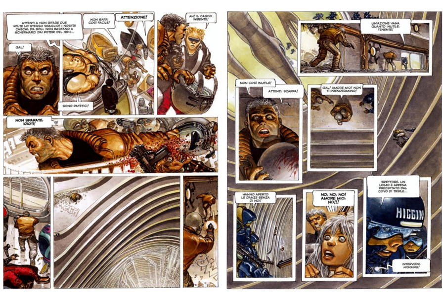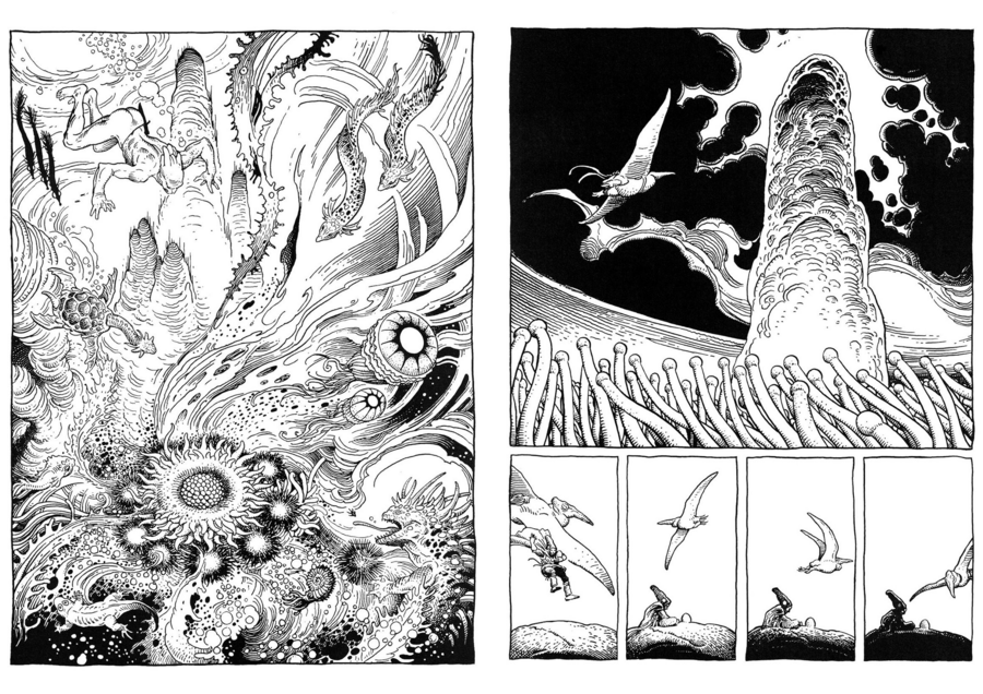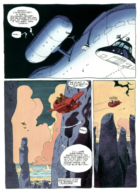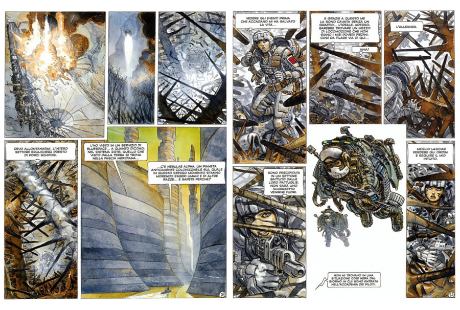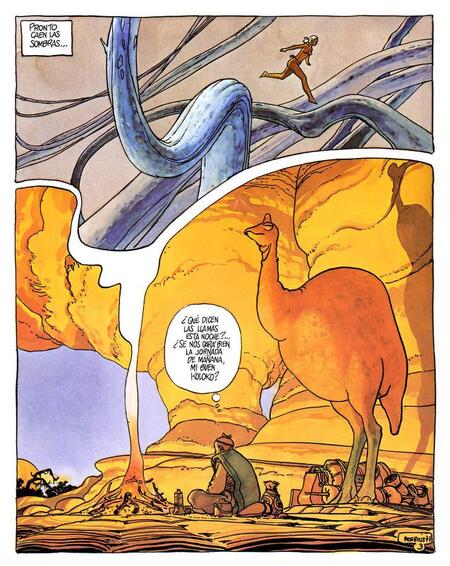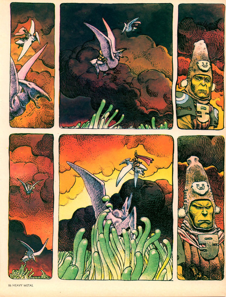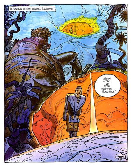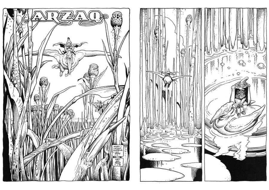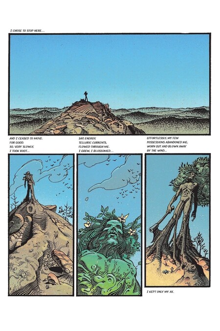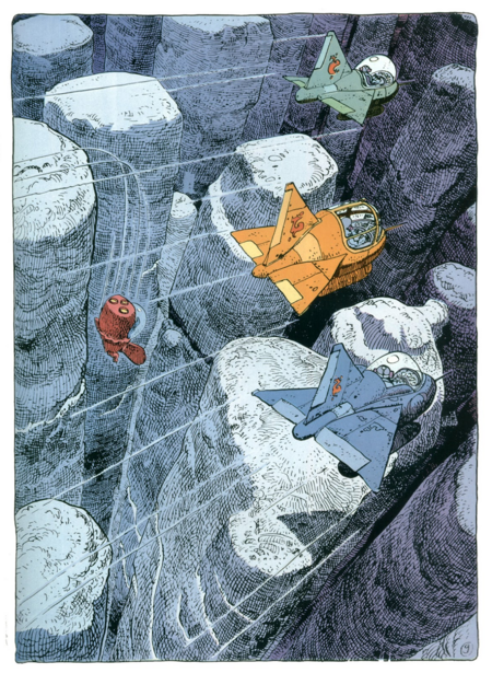Одной из особенностей комиксов Мёбиуса также являются большие природные пространства, вызывающие не то успокоение, не то тревогу. В его ландшафтах часто чувствуется дух постапокалиптического времени или доисторической эры. Природа в них не та, к которой мы привыкли, а человеческое вмешательство не ощутимо вовсе.
