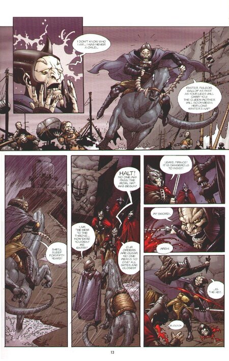 Произведения Дрюйе наполнены огромным количеством деталей. Часто такое изобилие дробных элементов визуально сливается в единую массу перетекающих друг в друга форм. На этом развороте, в частности, всадник будто является одним существом с лошадью. На доспехах виднеются крылья, а конь, в свою очередь, будто составлен из множества неровных веток и шипов, несмотря на свою механистическую природу.
