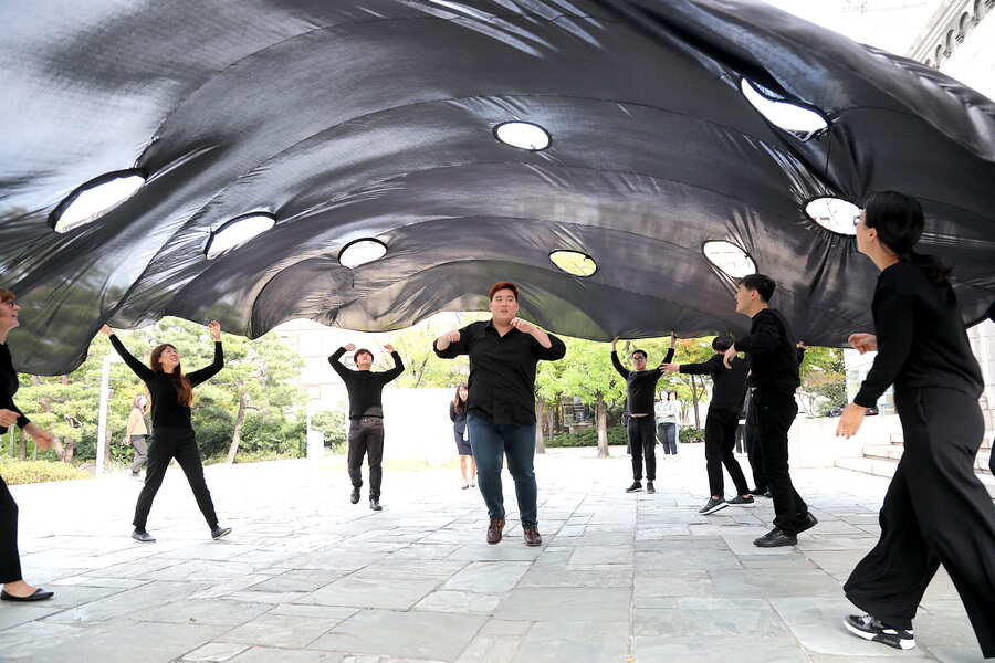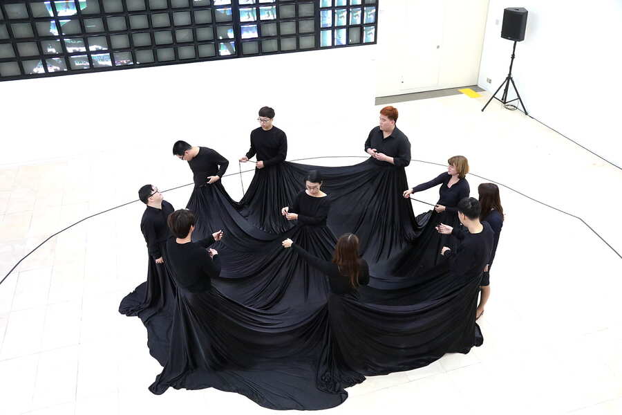 Через серию со-хореографических и звуковых практик художники исследовали звуковой ландшафт тропических дождей и перформативные итерации слов In и Out.