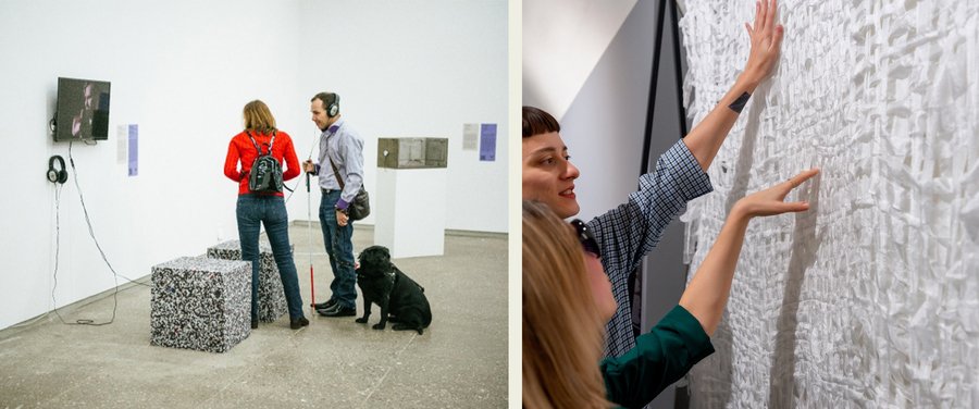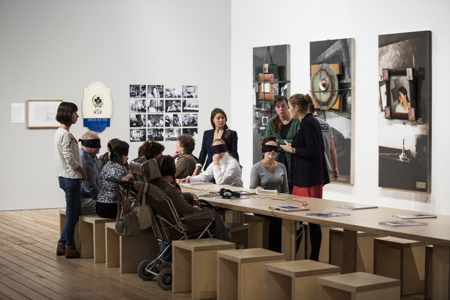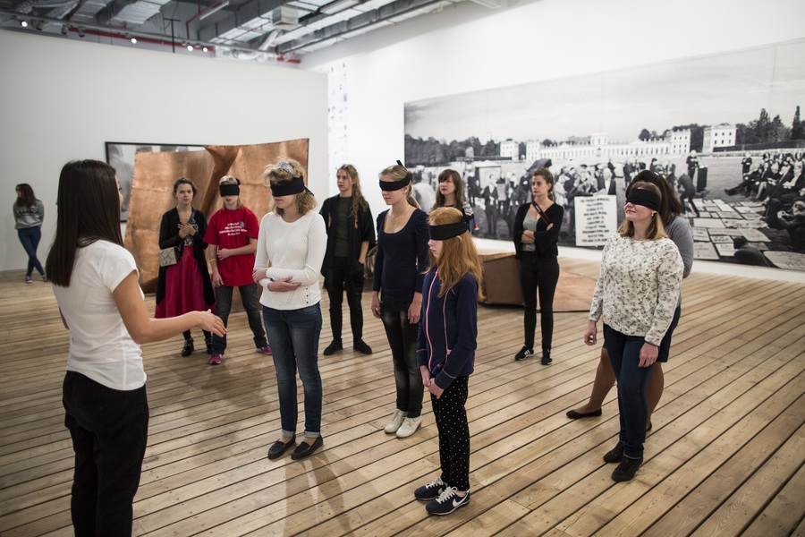 Практика исследования выставочного пространства с закрытыми глазами также задействовалась на воркшопе «Невидимый опыт» в Музее Гараж для обмена опытом по разработке образовательных программ для слабовидящих и незрячих посетителей. Во время семинаров участники знакомились с вариантами взаимодействия с людьми с особенностями, задействование слов, тактильных ощущений. Одним из мероприятий был мастер-класс «Трогательная скульптура», представляющий «техники развития эмпатии, понимания и внимания для людей с ограничениями по зрению и их близких. <…> Задача мастер-класса — создать среду для социализации участников, превратив современный музей в дружественное каждому пространство. Терапевтический эффект достигается путем погружения участников в самое тактильное из искусств — скульптуру. Использование разнообразных материалов — глины, пуха, дерева, металла, пластика — позволяет всем воплотить свои идеи и ощущения, не будучи скованными визуальностью произведений искусства. Один из ключевых элементов занятий — активное совместное творчество, поощряющее обмен опытом и знаниями; именно поэтому группа объединяет участников разных возрастов» [8].