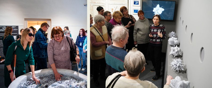 Участники мастерской «Окоём» изучили выставку в Музее русского импрессионизма, разделившись на две группы: в одной участники с завязанными глазами, а в другой — их сопровождающие. Педагог мастерских и руководитель инклюзивной программы в музее вели участников голосом по экспозиции, чтобы те, кто не видел, могли максимально прочувствовать атмосферу, а для описания работ использовались тифлокомментарии.
