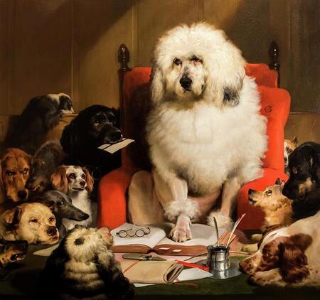На картине Ландсира мы видим пародию на человеческий суд. Собаки расставлены как реальные участники процесса: судья‑пудель в центре, присяжные, адвокаты, публика. У каждой породы есть «профессиональный» характер, но это именно маски социальных ролей, надетые на животных. Здесь нет конкретного дела, которое мы можем реконструировать, важен сам тип ситуации: бюрократический, формальный, немного абсурдный суд. Животные вводятся в институциональный человеческий сюжет как носители ролей, но мы не видим ничего за этими масками.