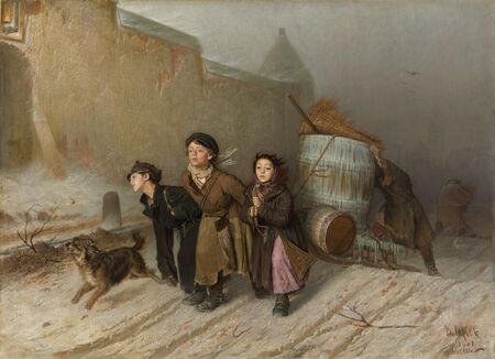 У Перова тот же сюжет как будто перенесен на людей. Вместо запряженных лошадей мы видим троих детей, которые тянут бочку с водой. Они идут также наклонно вперед, их тонкие тела повторяют позы тягловых животных. Лица уставшие, но собранные; одежда серая, фон пустой, но это уже социальный сценарий, а не просто жанровая сценка.