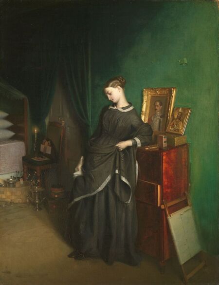 Две эти работы объединены пронизывающей скорбью. Правая картина выполнена в холодных тонах, которые с первого взгляда передают трагичную атмосферу. Главная героиня — молодая девушка, печально облокотившаяся на комод. Она будто пытается отвернуться от зрителя, в ее неестественно изогнутой позе и безжизненном выражении лица читается отчаяние.
