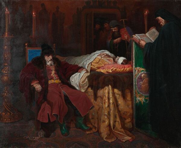 «Иоанн Грозный у тела убитого им сына», Вячеслав Шварц, 1864 https://my.tretyakov.ru/app/masterpiece/21149 (дата обращения: 20.11.25).