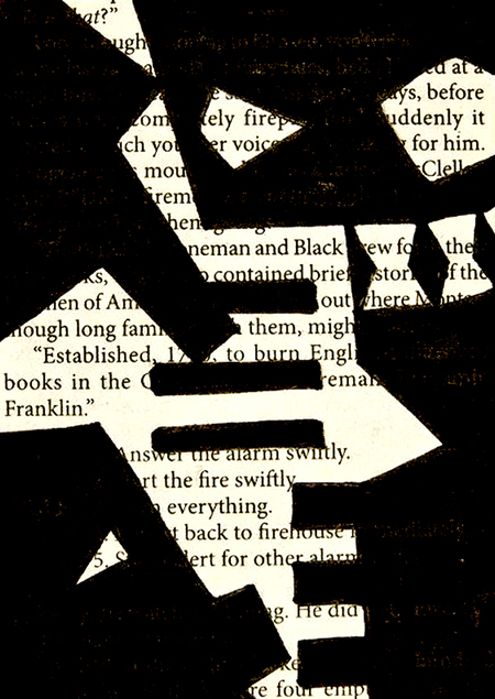 Черные фрагменты скрывают часть текста, создавая эффект цензуры — прямую отсылку к обществу, где информация контролируется и стирается. Красные рамки вокруг иллюстраций напоминают пламя, в котором сжигаются книги, а также служат метафорой границ, установленных обществом для подавления свободы мысли.