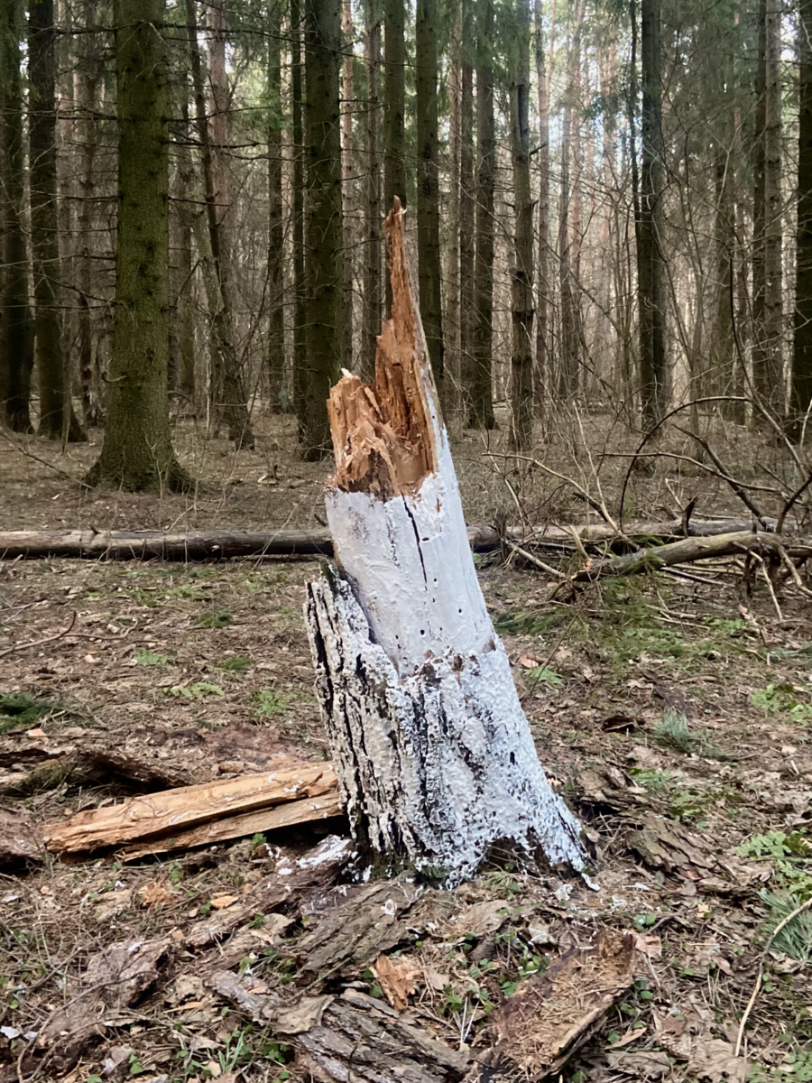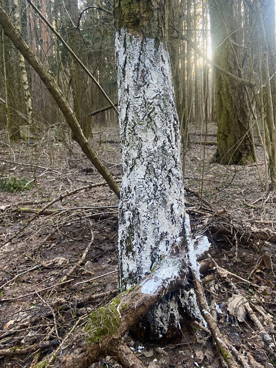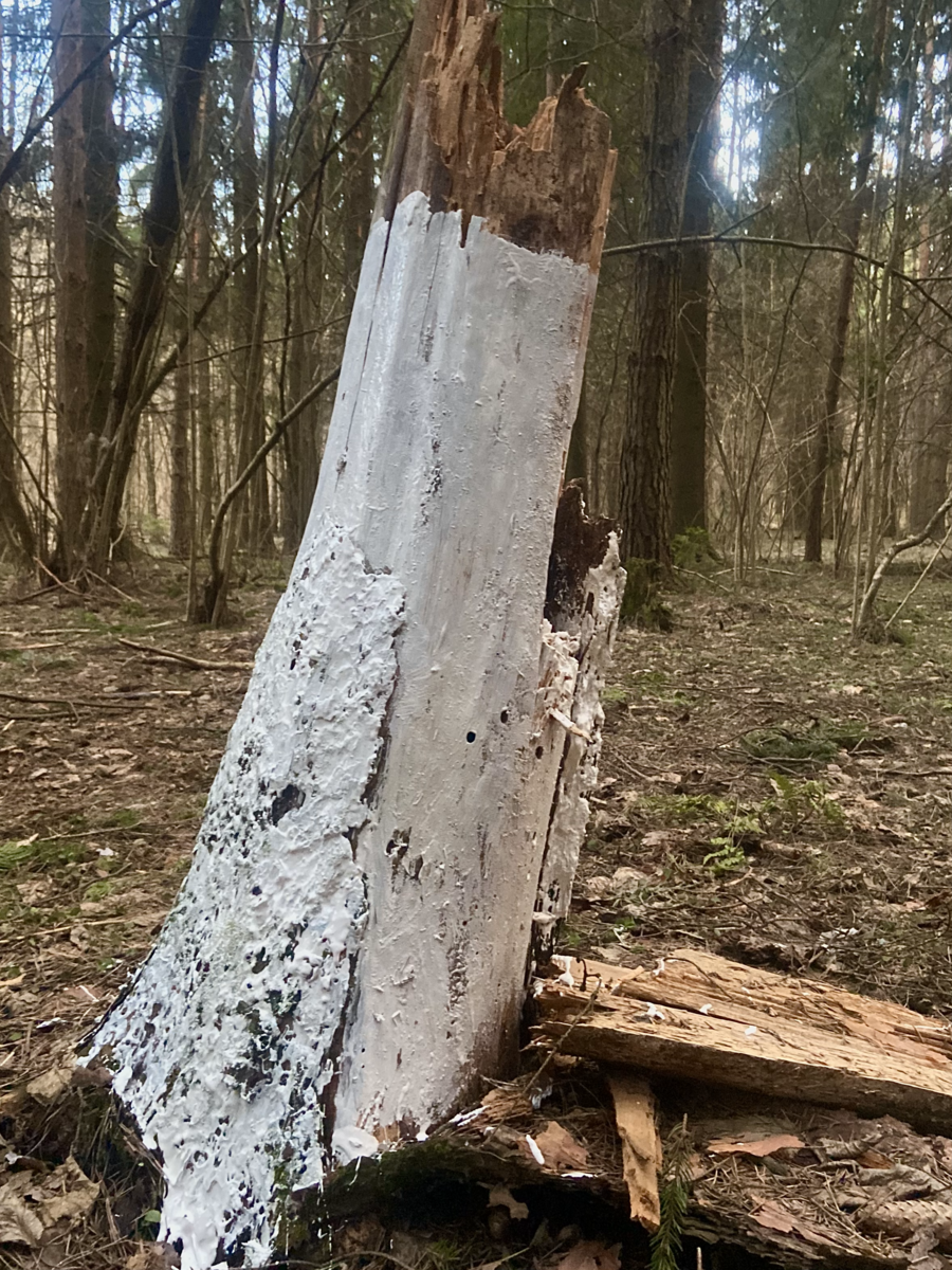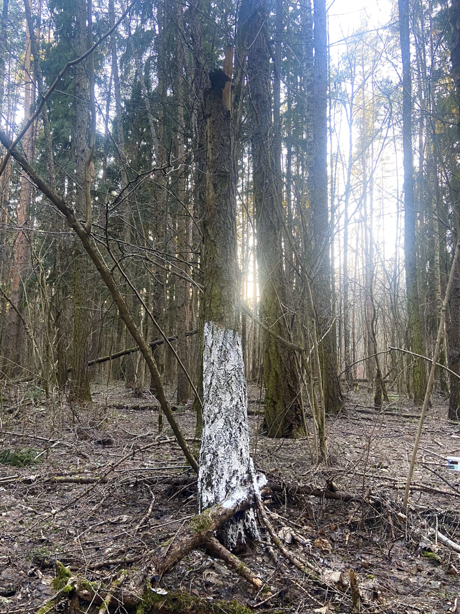 Мой проект заключается в том, что я белю уже мертвые деревья в лесу, пытаюсь спасти то, что уже спасти невозможно. Мои усилия бесполезны, моя борьба с силами природы уже заранее проиграна. В своей работе я хочу подчеркнуть, насколько человек, свято верящий в свое всемогущество, на самом деле бессилен перед силами природы, времени и судьбы.