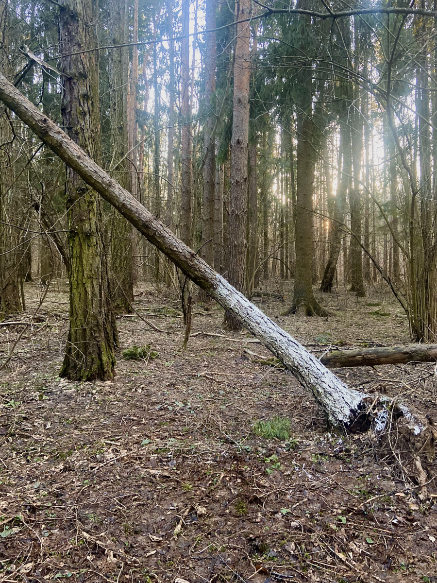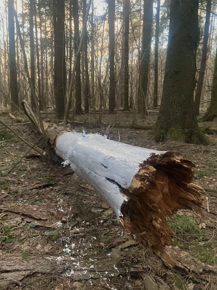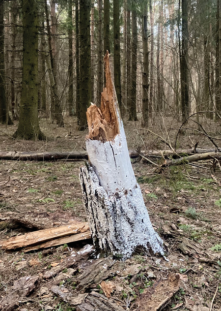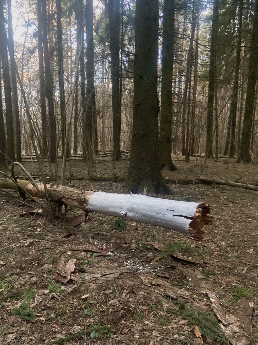 Мой проект заключается в том, что я белю уже мертвые деревья в лесу, пытаюсь спасти то, что уже спасти невозможно. Мои усилия бесполезны, моя борьба с силами природы уже заранее проиграна. В своей работе я хочу подчеркнуть, насколько человек, свято верящий в свое всемогущество, на самом деле бессилен перед силами природы, времени и судьбы.