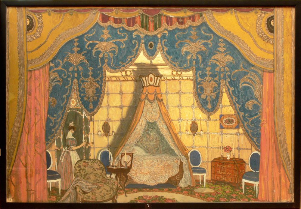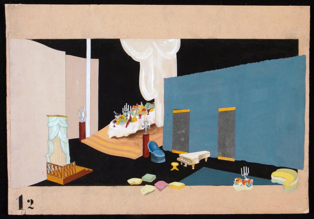 Два эскиза декорации Н. Сапунова к сцене бала сохранились: оба они показывают небольшой зальчик в доме у родителей Коломбины. Стены обиты ядовито-желтой материей с сиреневыми фестонами. Дверные, полукруглые сверху, проемы задрапированы пошлым красным бархатом с длинной золотой бахромой. В центре зальчика — крошечное возвышение эстрады для четырех музыкантов. В зальчике — теснота. Оба эскиза химеричны, оба поражают странным и необычным сочетанием жирной, наглой аляповатости и нервной взвинченности. Такого сочетания и добивался Мейерхольд. Ему важно было ввергнуть стремительную динамику игры трех старинных итальянских масок в российский ералаш, в пошлую фантасмагорию захолустной реальности. Традиционализм и эстетизация тут выступали в обнимку с мрачной сатирой.