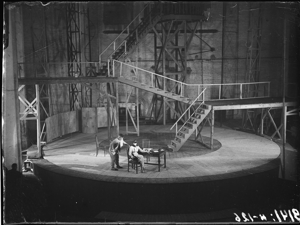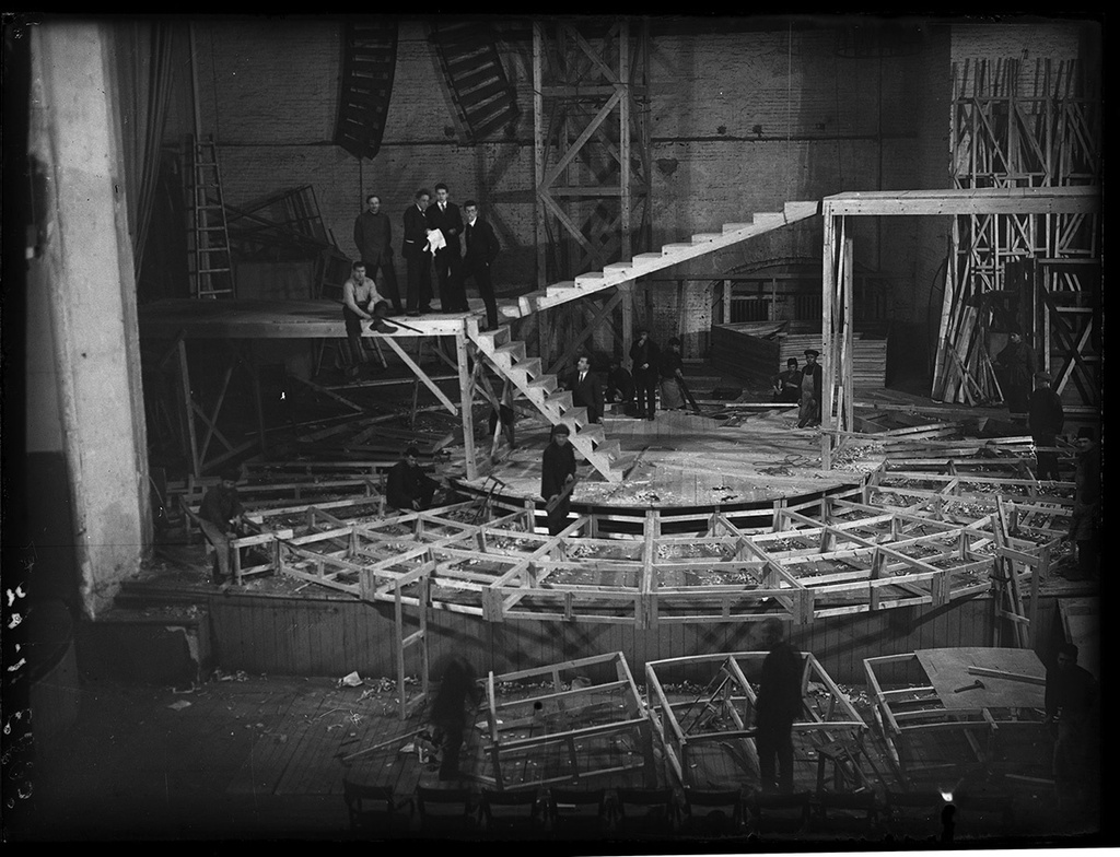 «Баня». 1930 г. | Постройка сценической конструкции для постановки пьесы Владимира Маяковского «Баня». Дата съемки: 1930 год