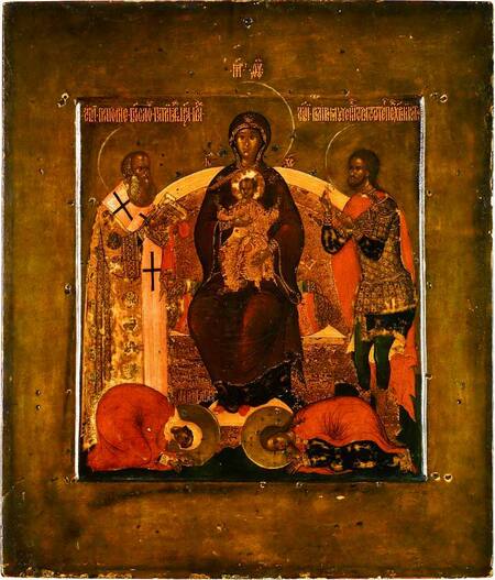 Икона созданная в память о родителях Никиты Григорьевича Строгонова. К Богоматери припадают святые — небесные покровители заказчика и его семьи. Также икона — это моление о собственном здравии и благополучии жены.